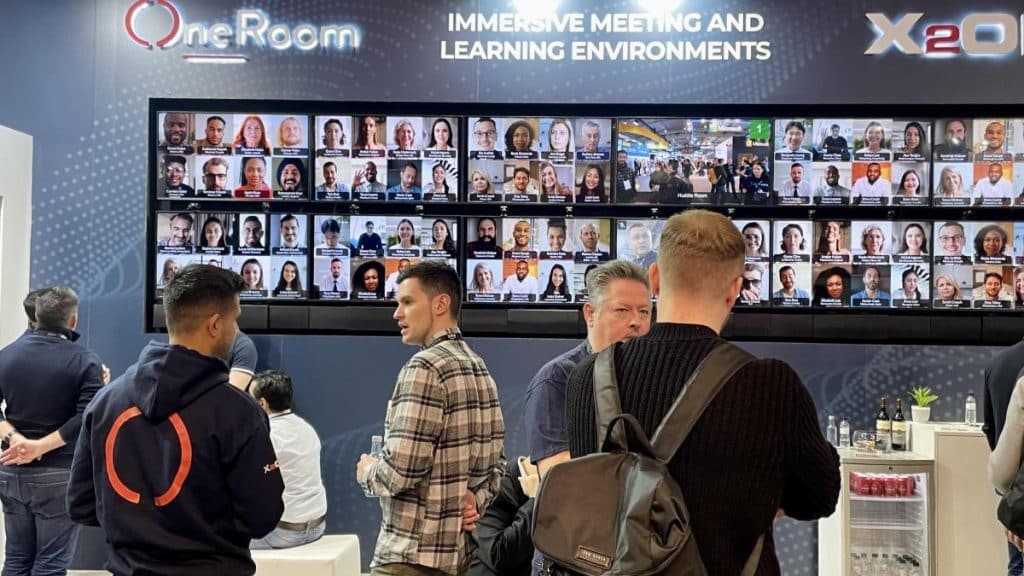 Attendees at the ISE fair, in front of the stand of a videoconferencing provider